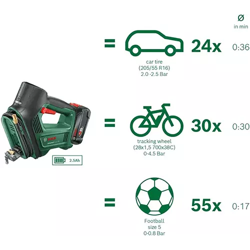Die Platzierung für den dritten Platz geht an die UniversalPump von Bosch. Eine sehr hochwertige Akku-Luftpumpe im Test mit ordentlich Leistung und externem Akku-Starter Set (18V Akku & Ladestation). Sollten Sie bereits Akku’s der Marke Bosch besitzen, kann die UniversalPump auch ohne Starter Set für eine erschwinglicheren Preis erworben werden.