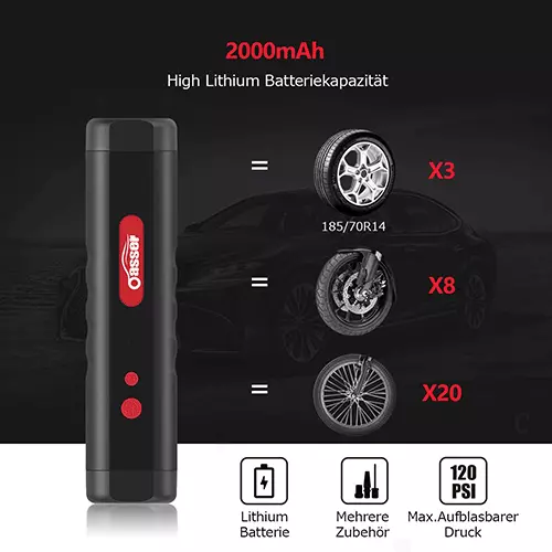 Auch diese beste Akku–Luftpumpe der Marke Oasser überzeugt mit einer überdurchschnittlich niedrigen Lautstärke in unserem Test. Hinsichtlich der Leistung muss man kleine Einsparungen machen, denn der Maximaldruck liegt bei nur knapp über 8 bar. Dazu kommt eine ziemlich geringe Akkukapazität von nur 2.000 mAh. Mithilfe eines 12 V Adapters lässt sich das Gerät aber zumindest auch im Auto laden.