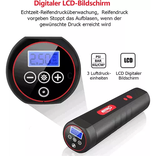 Mit einem Gewicht von knapp 430 Gramm und dem ergonomischen, schlanken Griff liegt die Luftpumpe sehr bequem in der Hand und lässt sich zeitgleich einfach und intuitiv bedienen. Voreinstellungen zu verschiedenen Reifenarten (Auto, Motorrad oder Fahrrad) sind bereits hinterlegt. Manuell lässt sich der benötigte Druckwert mit den entsprechenden Plus/Minus-Tasten unkompliziert einstellen.